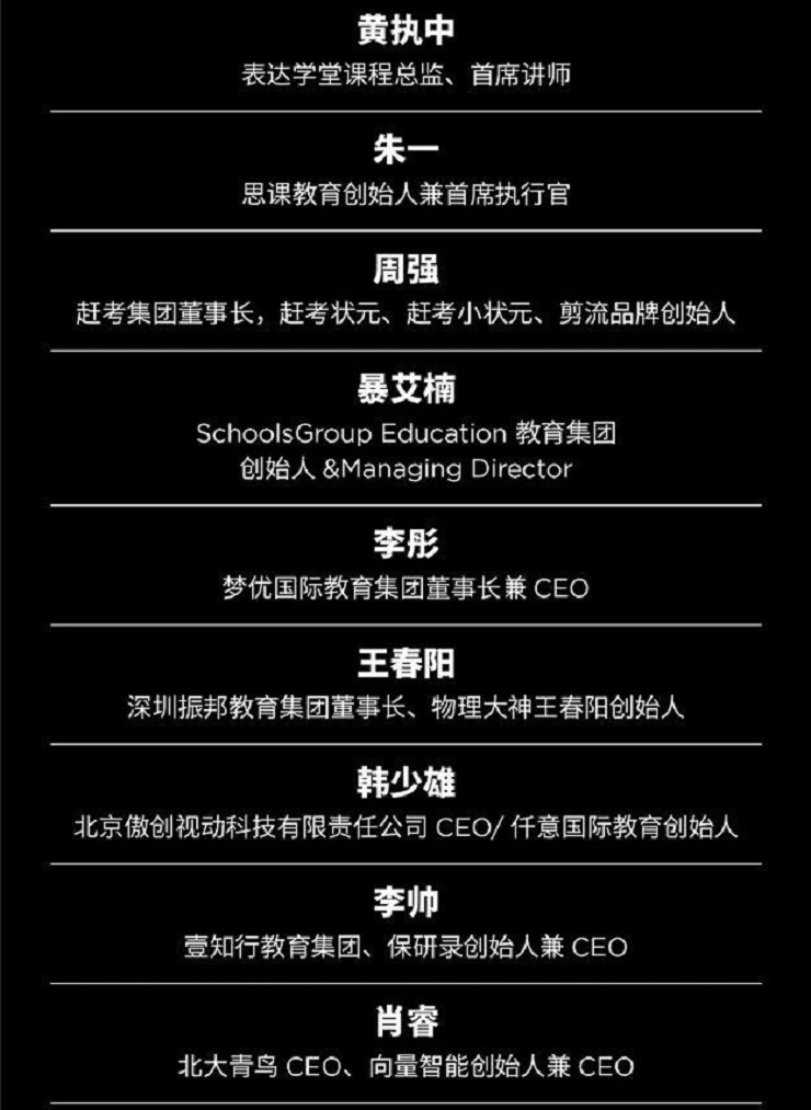 北京圆易文化传播有限公司创始人李楚潇;深圳芝士圈科技教育有限公司创始人侯宗原;表达学堂课程总监、首席讲师黄执中;思课教育创始人兼首席执行官朱一;赶考集团董事长,赶考状元、赶考小状元、剪流品牌创始人周强;SchoolsGroup Education 教育集团创始人&Managing Director暴艾楠;梦优国际教育集团董事长兼CEO李彤;深圳振邦教育集团董事长、物理大神王春阳创始人王春阳;北京傲创视动科技有限责任公司CEO/仟意国际教育创始人韩少雄先生;壹知行教育集团、保研录创始人兼CEO李帅。