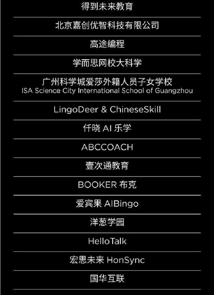 LingoDeer & ChineseSkill;仟晓AI乐学;ABCCOACH;壹次通教育;BOOKER布克;爱宾果AIBingo;洋葱学园;HelloTalk;宏思未来HonSync;国华互联。