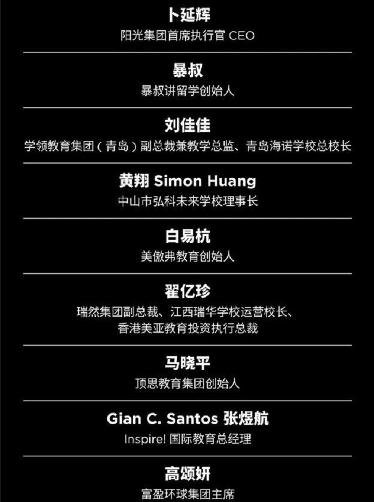 北京市海淀区稻香湖学校校长辛颖;Hti华通国际CEO王黔;阳光集团首席执行官CEO卜延辉;暴叔讲留学创始人暴叔;学领教育集团(青岛) 副总裁兼教学总监&青岛海诺学校总校长刘佳佳;中山市弘科未来学校理事长黄翔Simon Huang;美傲弗教育创始人白易杭;瑞然集团副总裁、江西瑞华学校运营校长&香港美亚教育投资执行总裁翟亿珍;顶思教育集团创始人马晓平;Inspire!国际教育总经理Gian C. Santos张煜航;富盈环球集团主席高颂妍;广东华侨中学国际部校长/主任吴诗苑