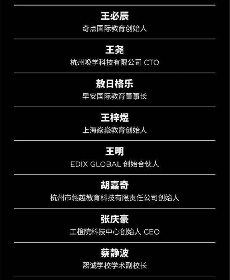 亦丰国际教育创始人王亦丰;庾丰国际教育创始人夏庾丰;Silicon Valley CircleFounder & CEO欧妍Alice Ou;傲世达教育创始人李赞;奇点国际教育创始人王必辰;杭州唤学科技有限公司CTO王尧;早安国际教育董事长敖日格乐;上海焱焱教育创始人王梓煜;EDIX GLOBAL创始合伙人王明;杭州市翎越教育科技有限责任公司创始人胡嘉奇;工橙院科技中心创始人&CEO张庆豪;熙诚学校学术副校长蔡静波。