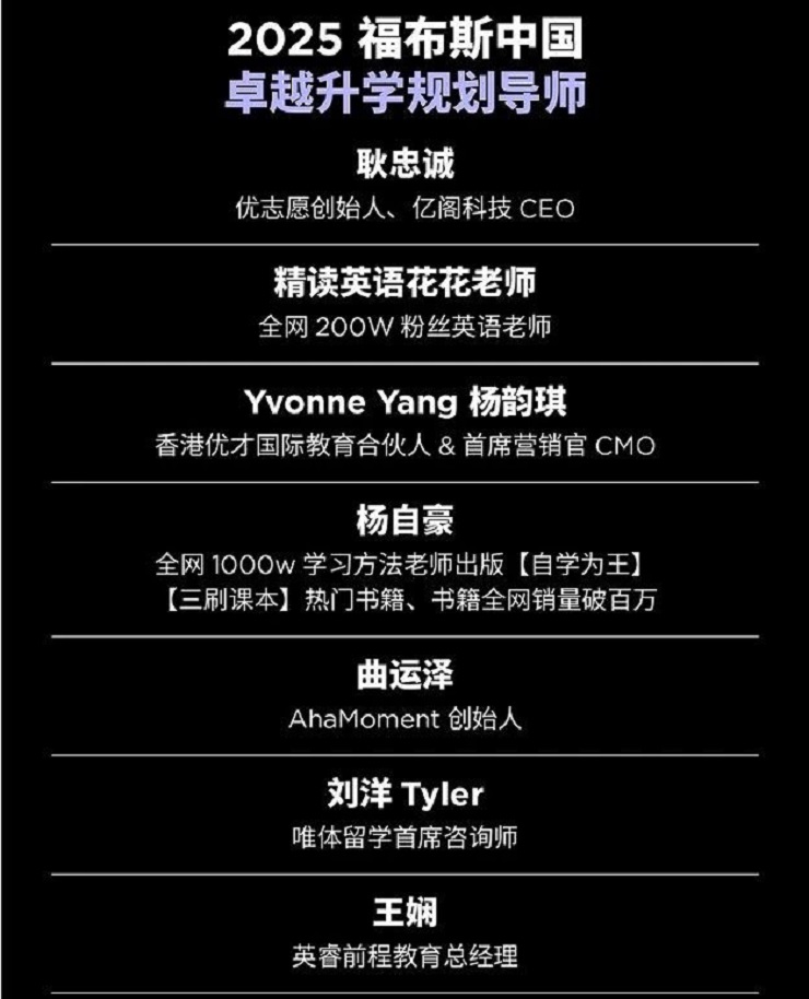 优志愿创始人、亿阁科技CEO耿忠诚;全网200W粉丝英语老师 精读英语花花老师;香港优才国际教育合伙人&首席营销官CMO Yvonne Yang 杨韵琪;全网1000w学习方法老师、出版【自学为王】【三刷课本】热门书籍、书籍全网销量破百万杨自豪;AhaMoment创始人曲运泽;唯体留学首席咨询师刘洋Tyler;英睿前程教育总经理王娴;高顿集团升学规划导师徐炳田;途策留学创始人乔禹;浙江沃顿留学创始人袁婷;维亚普留学 留学规划总监兼留学合伙人卢飞。