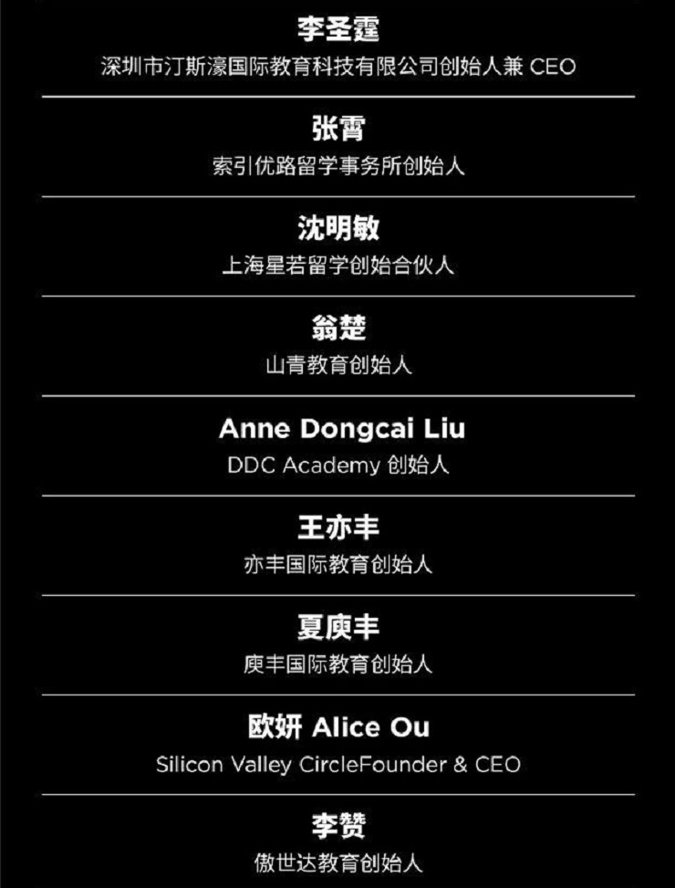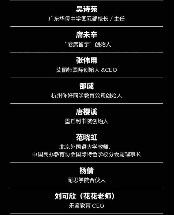 “老席留学”创始人席未辛;艾俪特国际创始人&CEO张伟用;杭州你好同学教育公司创始人邵威;墨丘利书院创始人唐樱溪;北京外国语大学教师、中国民办教育协会国际特色学校分会副理事长范晓虹;耐思学院合伙人杨倩;乐鉴教育CEO刘可欣(花花老师);深圳市汀斯濠国际教育科技有限公司创始人兼CEO李圣霆;索引优路留学事务所创始人张霄;上海星若留学创始合伙人沈明敏;山青教育创始人翁楚;DDC Academy创始人Anne Dongcai Liu