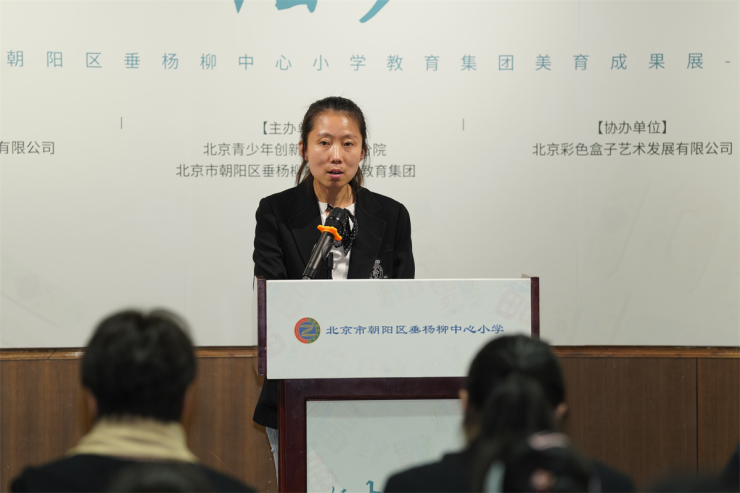 北京市学生金帆书画院负责领导吴蔚老师随后发言,对垂杨柳中心小学在金帆书画院建设、学生艺术素养培养方面取得的显著成果表示高度赞赏,肯定了学校在美育拔尖人才培育上的努力与成效。