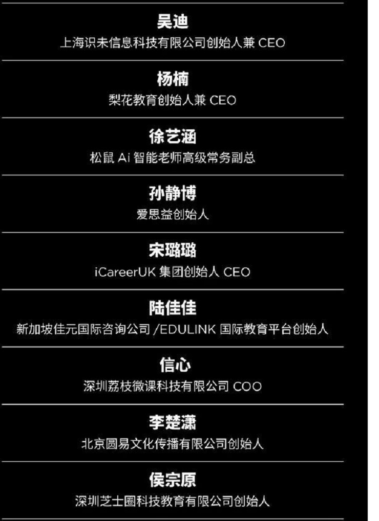北京圆易文化传播有限公司创始人李楚潇;深圳芝士圈科技教育有限公司创始人侯宗原;表达学堂课程总监、首席讲师黄执中;思课教育创始人兼首席执行官朱一;赶考集团董事长,赶考状元、赶考小状元、剪流品牌创始人周强;SchoolsGroup Education 教育集团创始人&Managing Director暴艾楠;梦优国际教育集团董事长兼CEO李彤;深圳振邦教育集团董事长、物理大神王春阳创始人王春阳;北京傲创视动科技有限责任公司CEO/仟意国际教育创始人韩少雄先生;壹知行教育集团、保研录创始人兼CEO李帅。