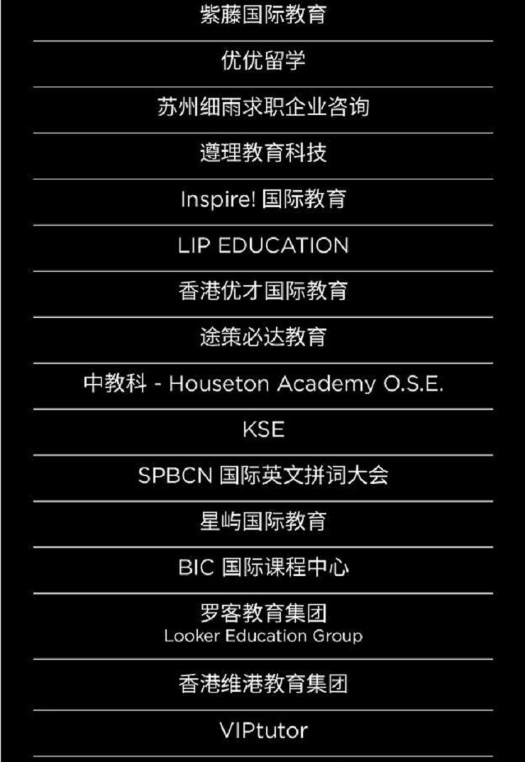 SPBCN国际英文拼词大会;星屿国际教育;BIC 国际课程中心;罗客教育集团Looker Education Group;香港维港教育集团;VIPtutor;无锡市协和双语学校;Behere留学(九扬国际教育);上海林国荣学校;ASART国际艺术教育;JNC国际暑期学校平台。